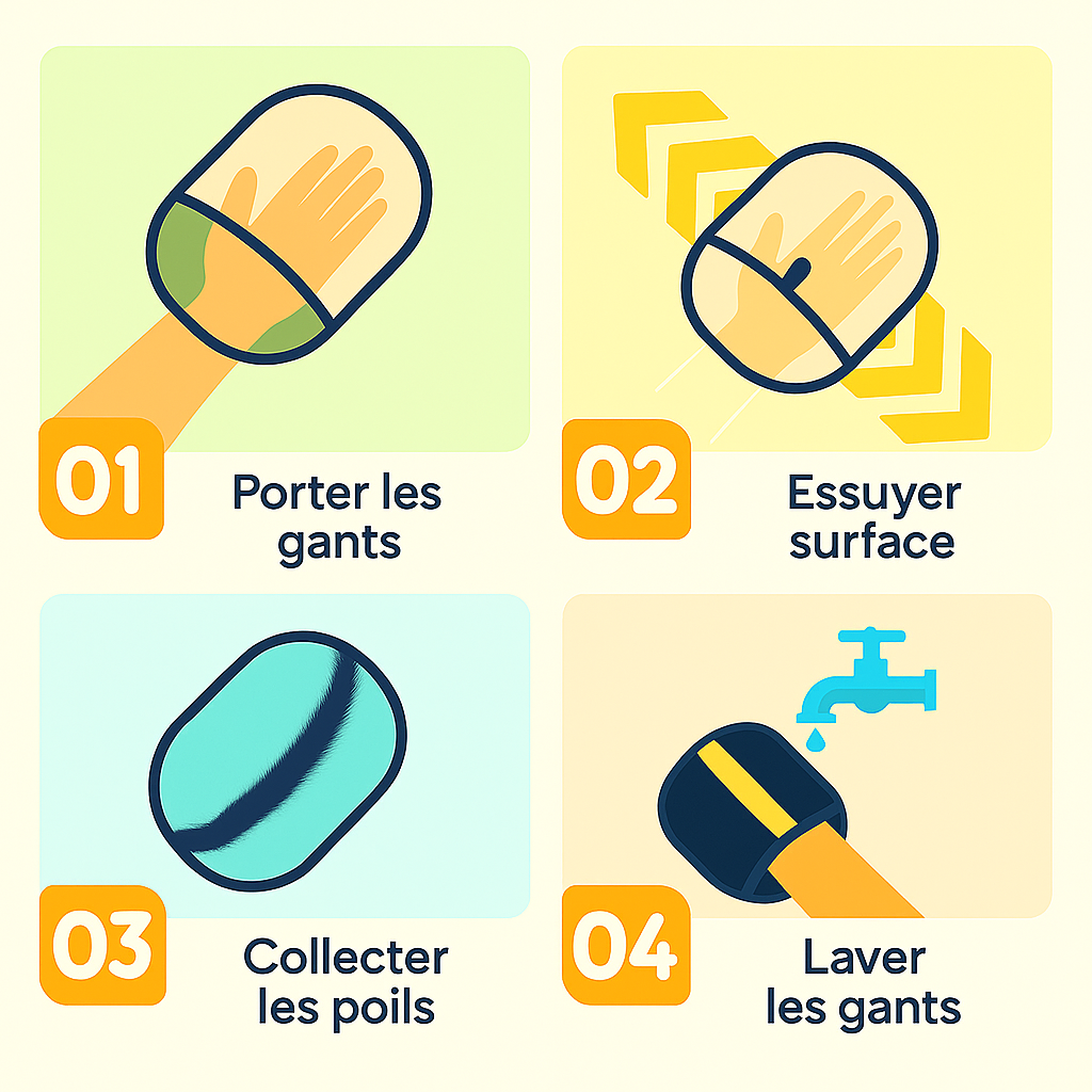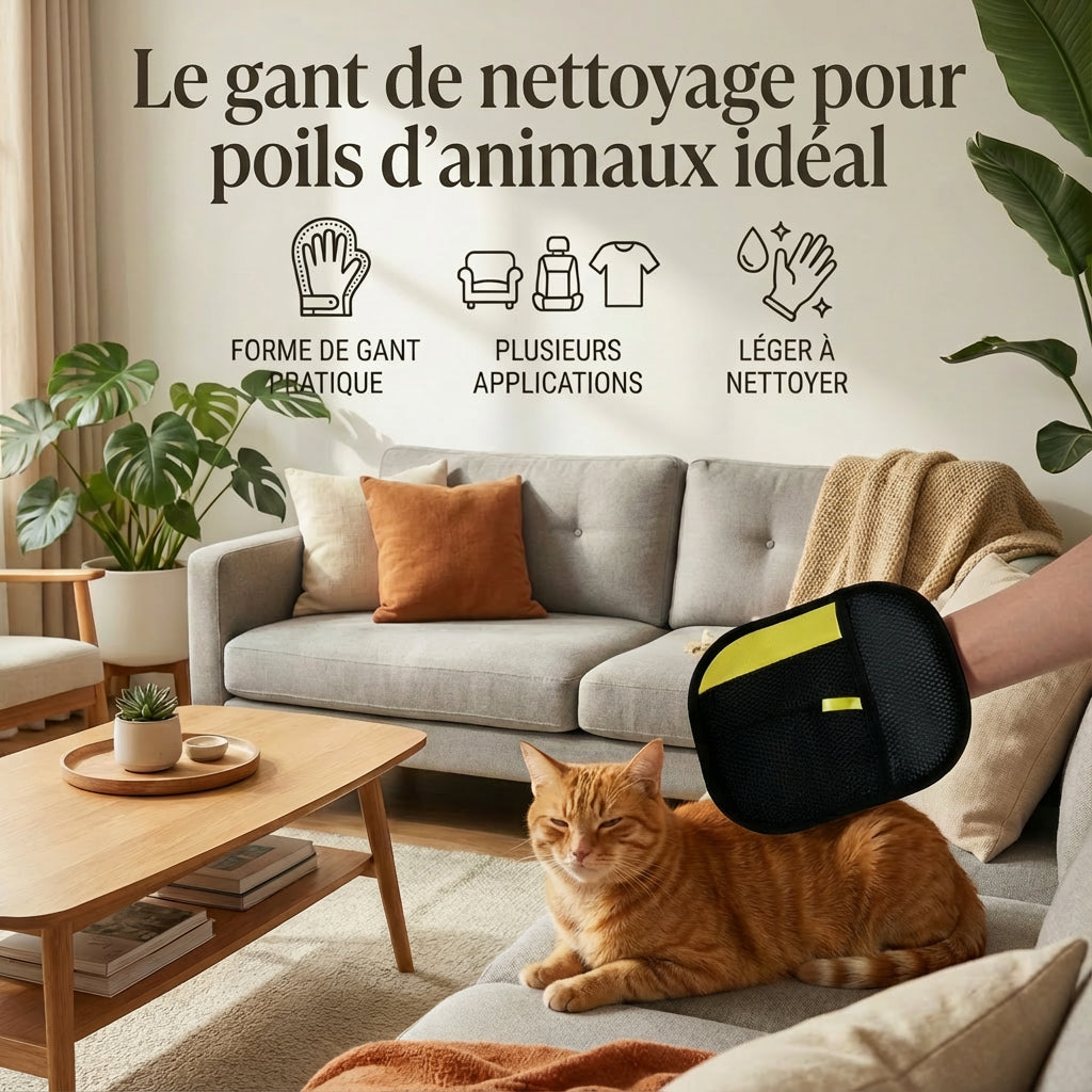 aux poils d’animaux envahissants grâce à nos gants de nettoyage innovants ! Conçus pour capturer efficacement les poils sur les meubles, les vêtements, les canapés, l’intérieur de votre voiture... Ils vous aident à garder un espace impeccable en un geste.